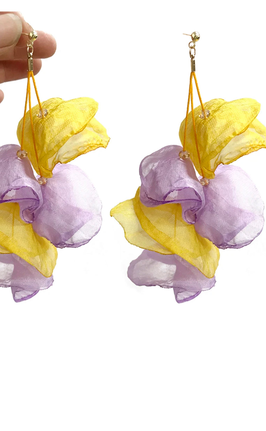 Love these light flower petal earrings on a posts. Featuring our Tiger Design in Purple 7 Gold soft petals. Great game day earring. Approximately 4” length