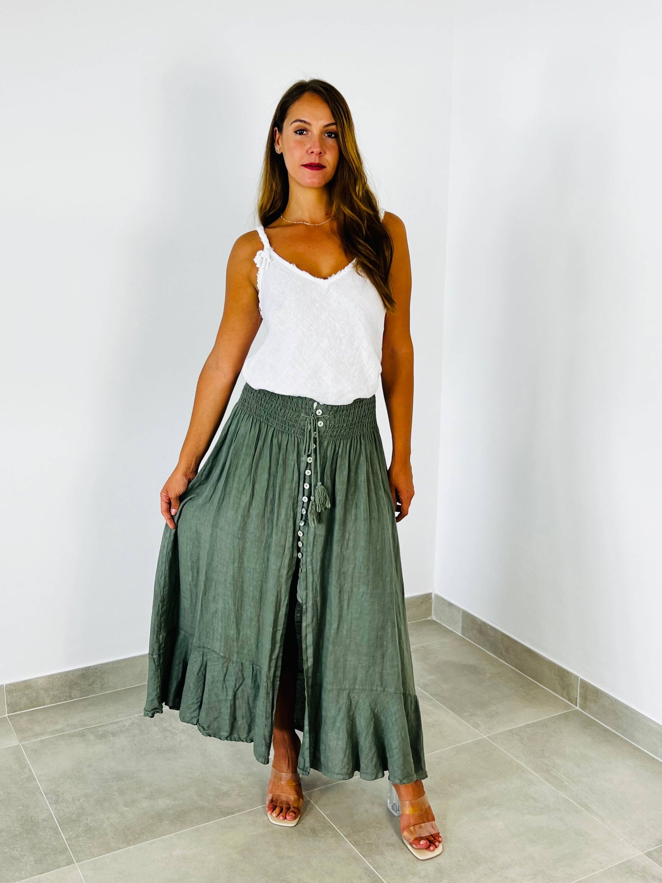 BUTTON LINEN SKIRT, 100% LINEN ELASTIC WAIST