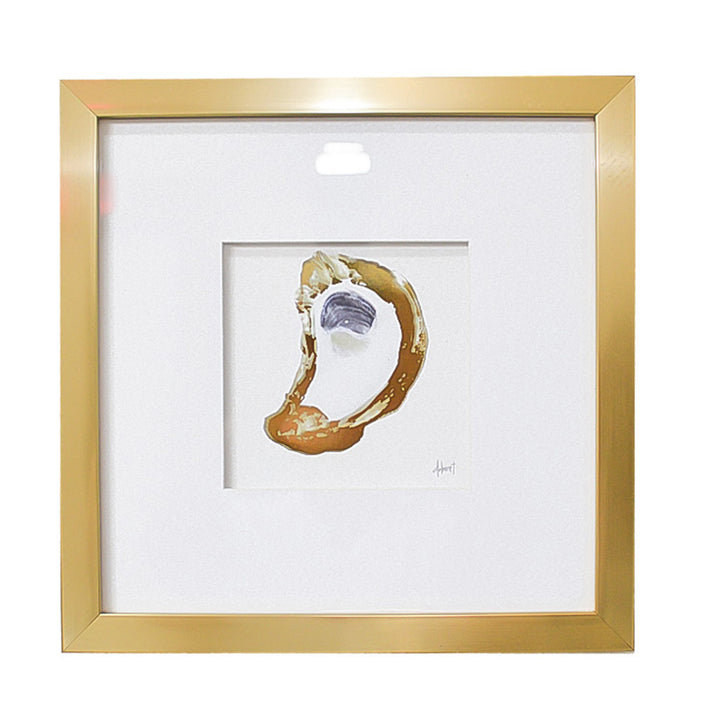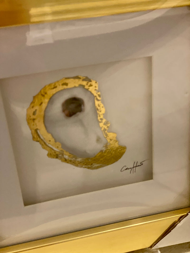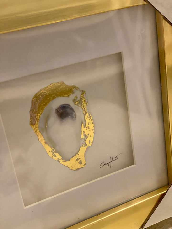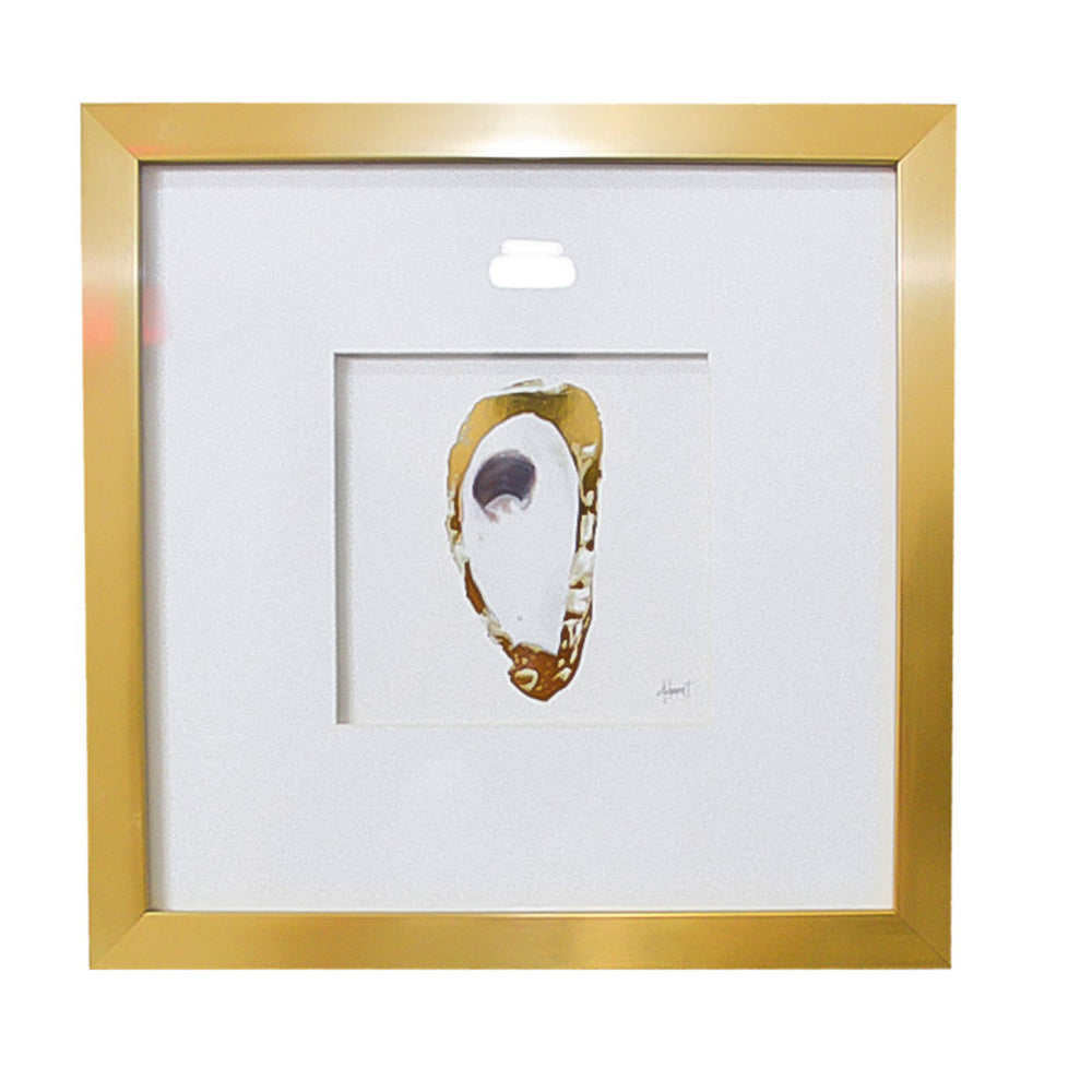 Oysters make up a part of our collective history. They were used in Native American burial mounds. As symbols, their fashion has never gone out of style. Gold foil, signed with card on the back, and gorgeously framed.