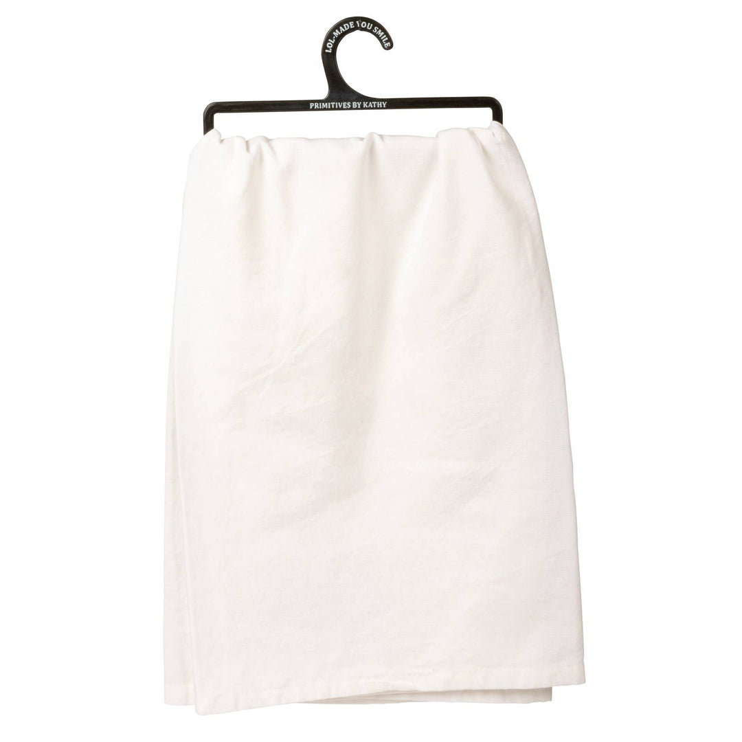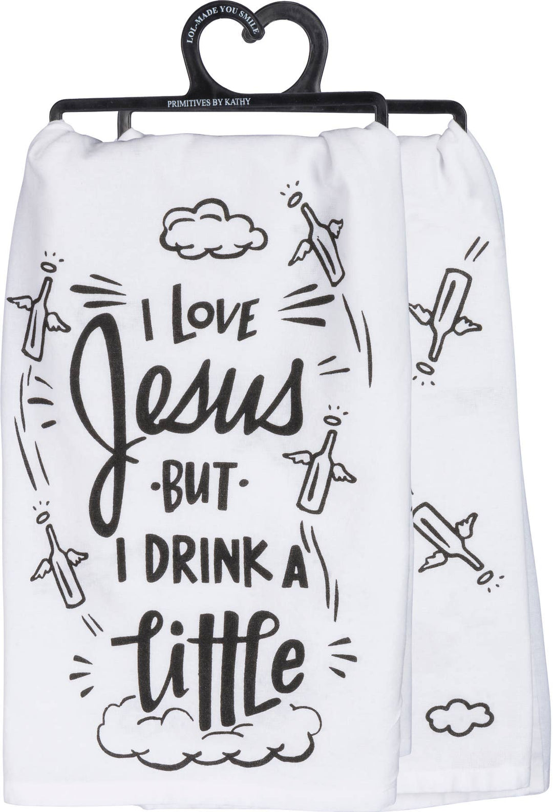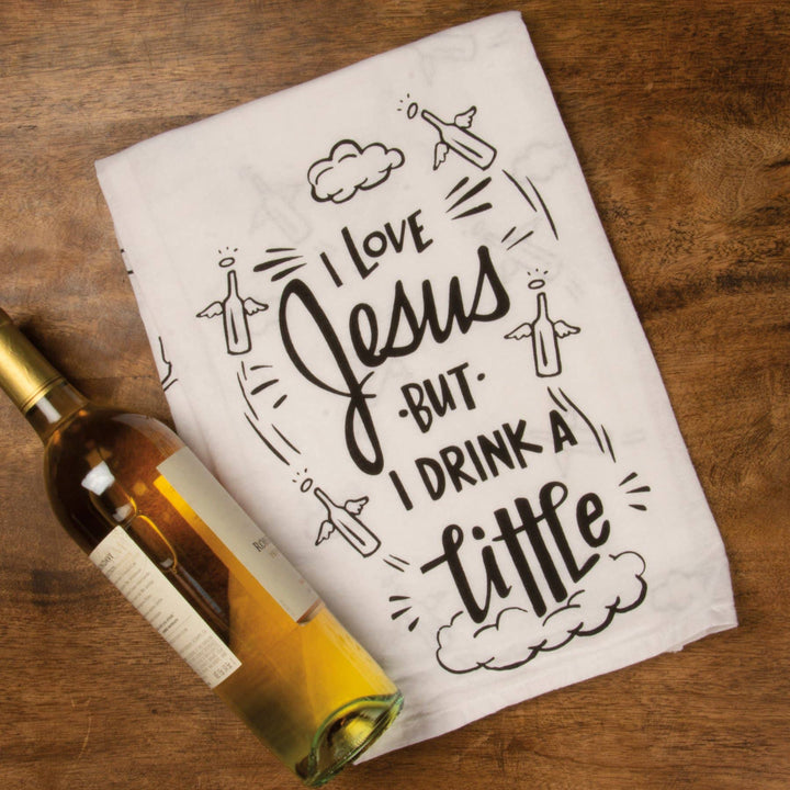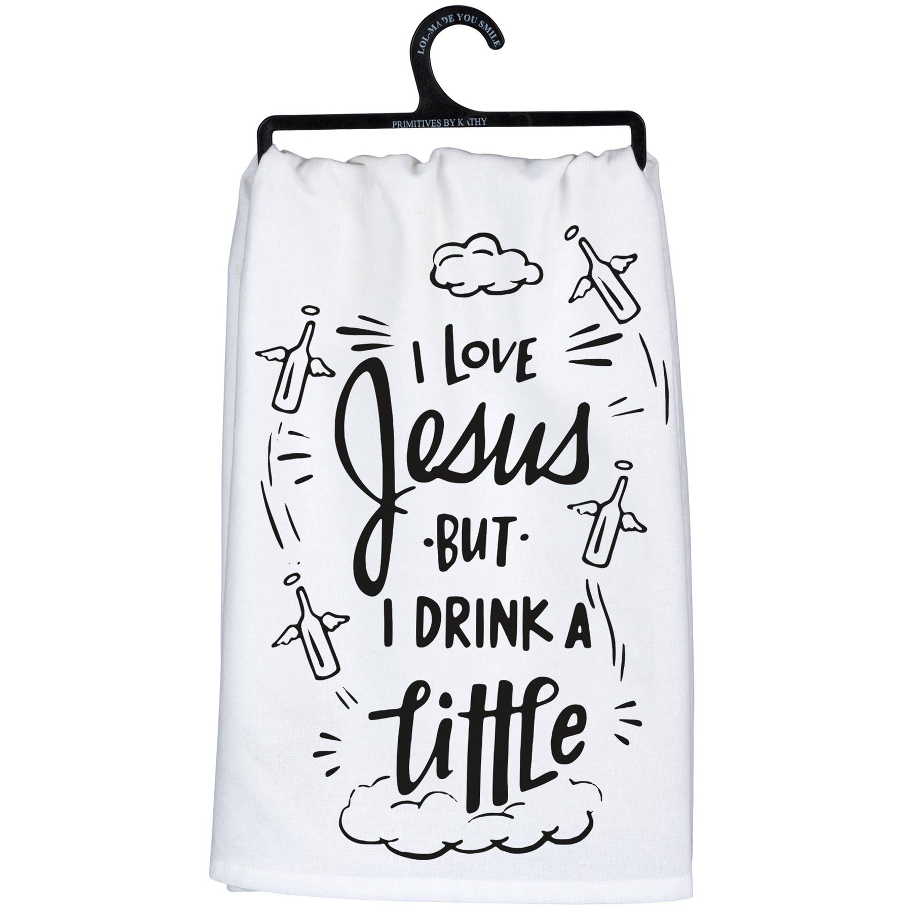 A black and white cotton kitchen towel featuring "I Love Jesus But I Drink A Little" sentiment with double-sided cloud and angel wine bottle designs. Machine-washable.