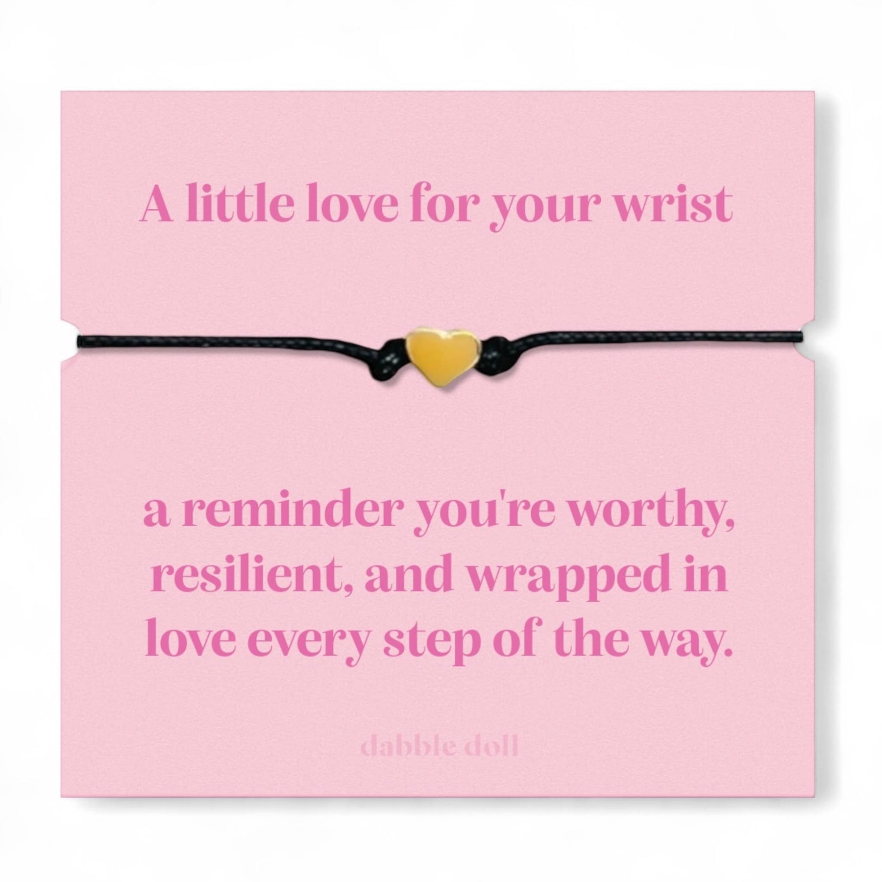 Gold Heart Cord Bracelet – “A Little Love” Message Card Delight your customers with this heartfelt, gift-ready bracelet that blends meaning with minimalist charm. Featuring a delicate gold heart charm on an adjustable cord, this piece comes displayed on a premium backing card that reads: “A little love for your wrist — a reminder you’re worthy, resilient, and wrapped in love every step of the way.” Perfect for self-care gifts, encouragement packages, or just-because surprises, this bracelet is a top seller for gift shops, boutiques, and wellness retailers alike.
