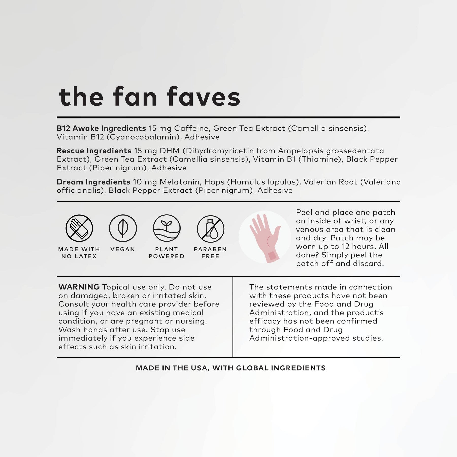 The Fan Faves Set includes 1 B12 Awake patch, 1 Dream patch, and 1 Rescue patch, for 3 patches total. This patch sampler trio is the ultimate travel companion or stocking stuffer for the holiday season! B12 Awake (1 patch): Dream (1 patch): Restful zzz's, no matter where you're sleeping Rescue (1 patch): Bounce back from holiday party after holiday party Key