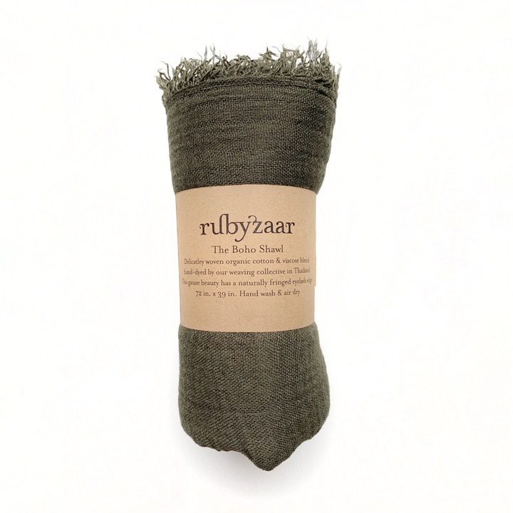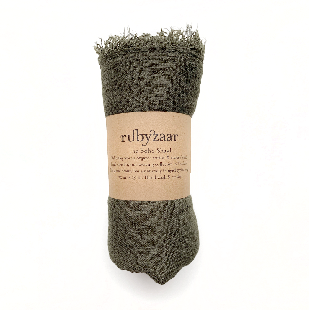 Delicately woven cotton & viscose shawl. Hand dyed by our weaving collective in Thailand. This gauze beauty has a naturally fringed eyelash edge. 72” x 39” Our best selling bohemian style scarf is the perfect accessory for any occasion. Buttery soft and fabulous. 85% cotton, 15% bamboo Hand or machine wash gentle cycle