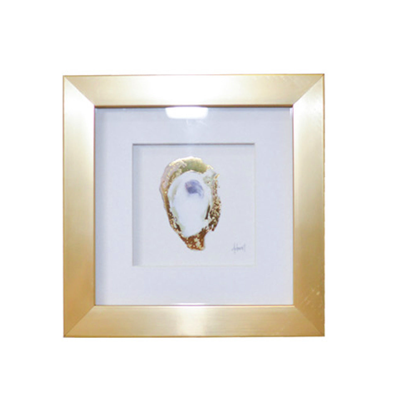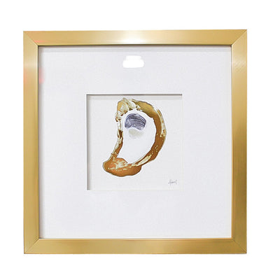 Oysters make up a part of our collective history. They were used in Native American burial mounds. As symbols, their fashion has never gone out of style. Gold foil, signed with card on the back, and gorgeously framed.